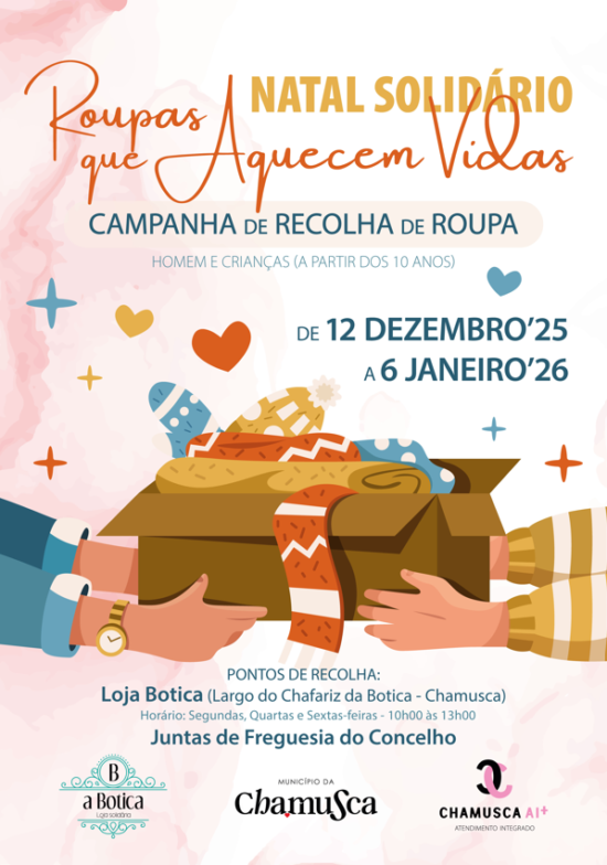 O Município da Chamusca, através da Loja Solidária “A Botica”, tem a decorrer a campanha “Natal Solidário: Roupas que Aquecem Vidas”, uma iniciativa que pretende reforçar o apoio social às famílias mais vulneráveis do concelho durante esta época festiva.
