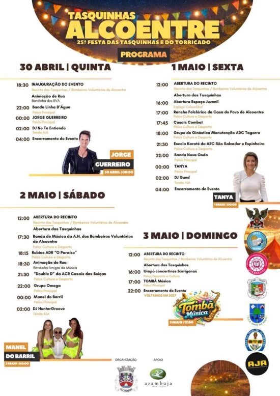 A freguesia de Alcoentre recebe, entre os dias 30 de abril e 3 de maio, a 25.ª edição da Festa das Tasquinhas e do Torricado, um evento integrado na estratégia “Azambuja – Terras do Torricado”.