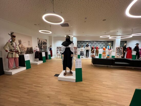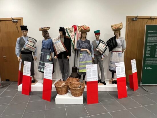 A exposição conta com 110 trajes, sendo cerca de quatro dezenas de origem internacional. As peças expostas fazem parte do espólio da própria Associação FIFCA, acumuladas ao longo de anos de intercâmbio cultural. Muitas destas peças foram doadas pelos grupos que passaram pelas edições anteriores do festival, outras cedidas ou doadas pelos Municípios e Juntas de Freguesia parceiros do FIFCA, além de generosas cedências de particulares para a exposição. Perto de 50 trajes são património do casal Ricardo Casebre e Irene Sequeira, dançarinos e atuais Presidente da Direção e Presidente AG da Associação FIFCA, respetivamente.